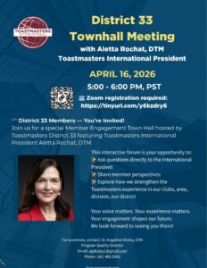 Join us for a special Member Engagement Town Hall hosted by Toastmasters District 33 featuring Toastmasters International President Aletta Rochat, DTM.