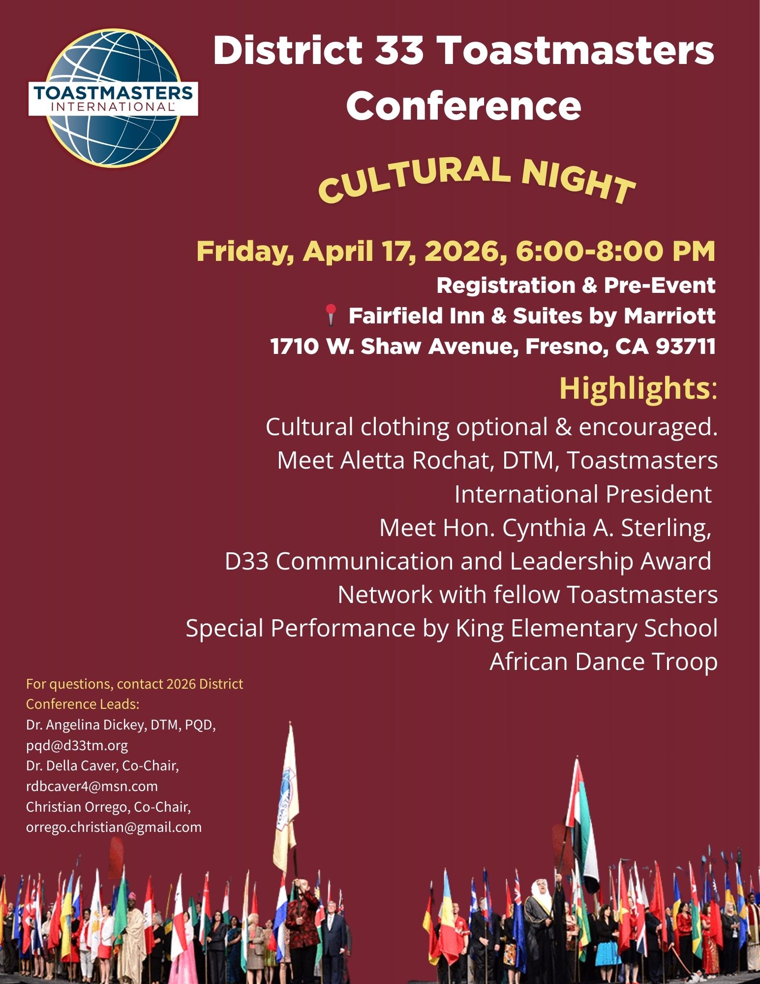 This event represents the best of District 33 — collaboration, leadership, and a shared commitment to excellence. Under the leadership of Conference Co-Chairs Christian Orrego and Dr. Della Caver, along with a dedicated conference team including Steve Estrada (Division F Director), Eumi Sprague, DTM, and Sheri Mauro, preparations are well underway to create a conference experience you won’t forget.